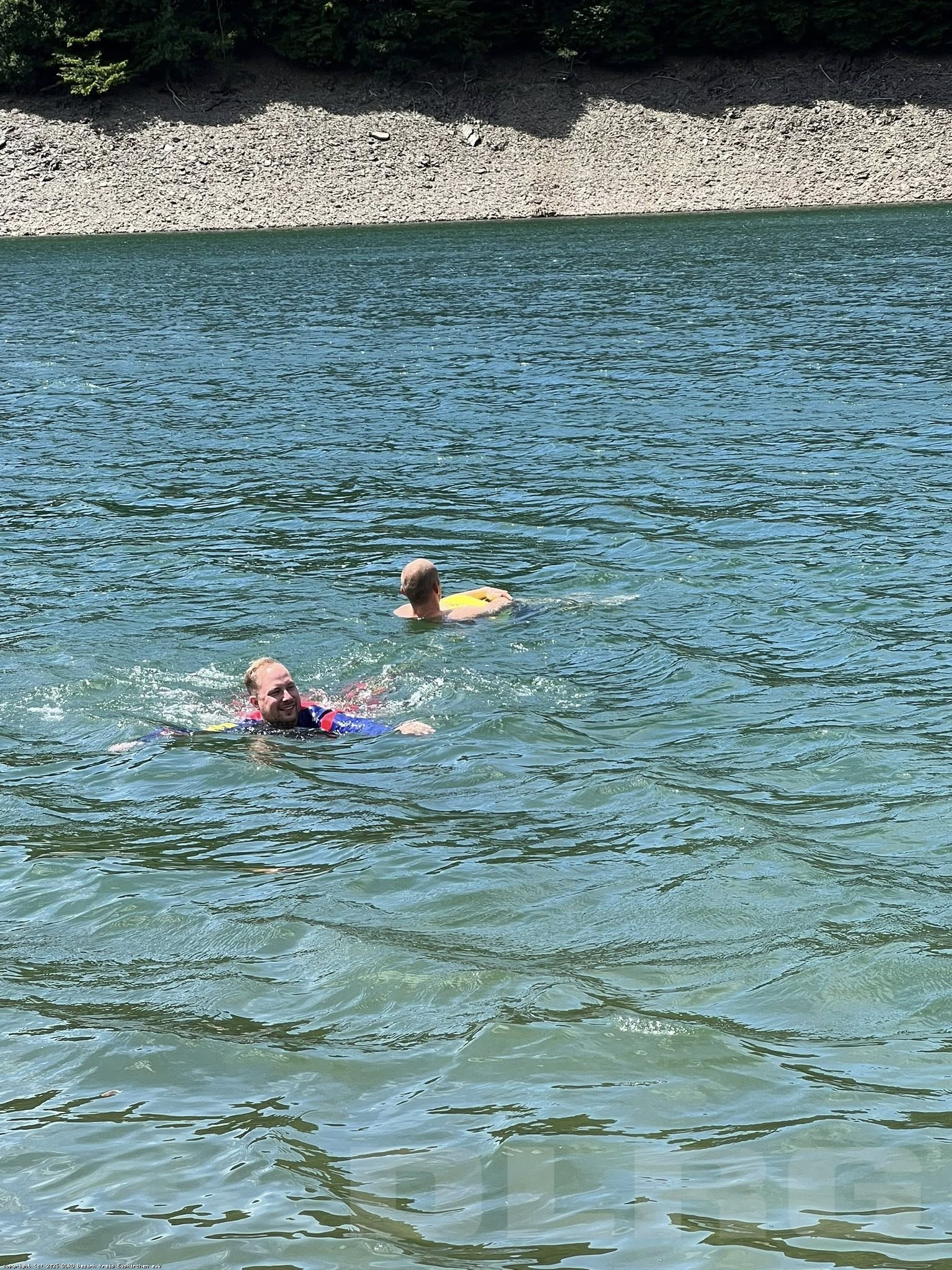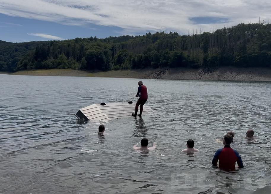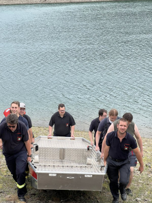 Am Ende musste natürlich noch getestet werden, ob das neue Boot wirklich unsinkbar ist – ist es! Unter Anleitung einer erfahrenen DLRG-Einsatzkraft, haben die Feuerwehrleute gelernt, wie man das gekenterte Boot wieder sicher aufrichten kann.