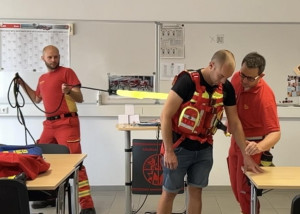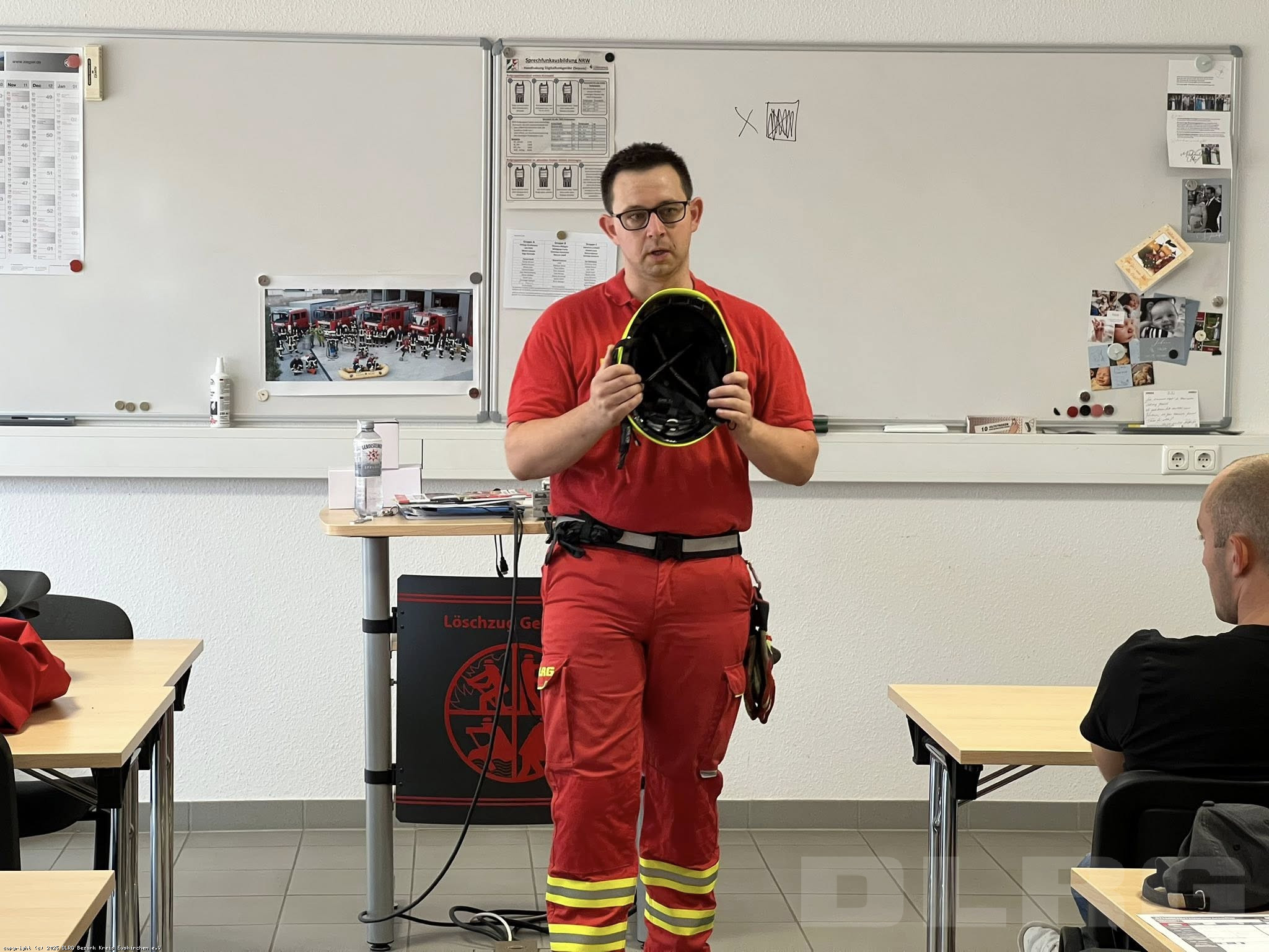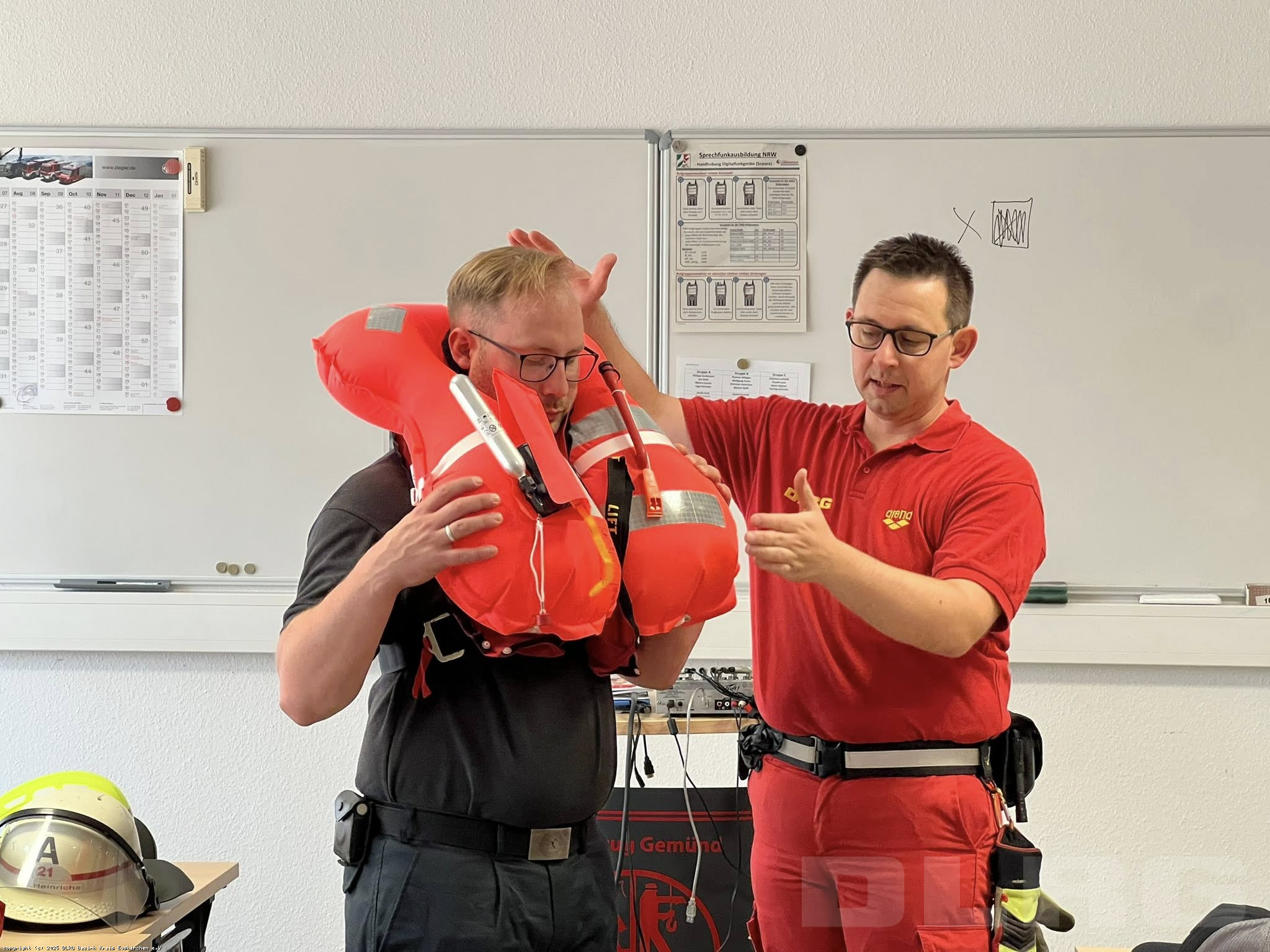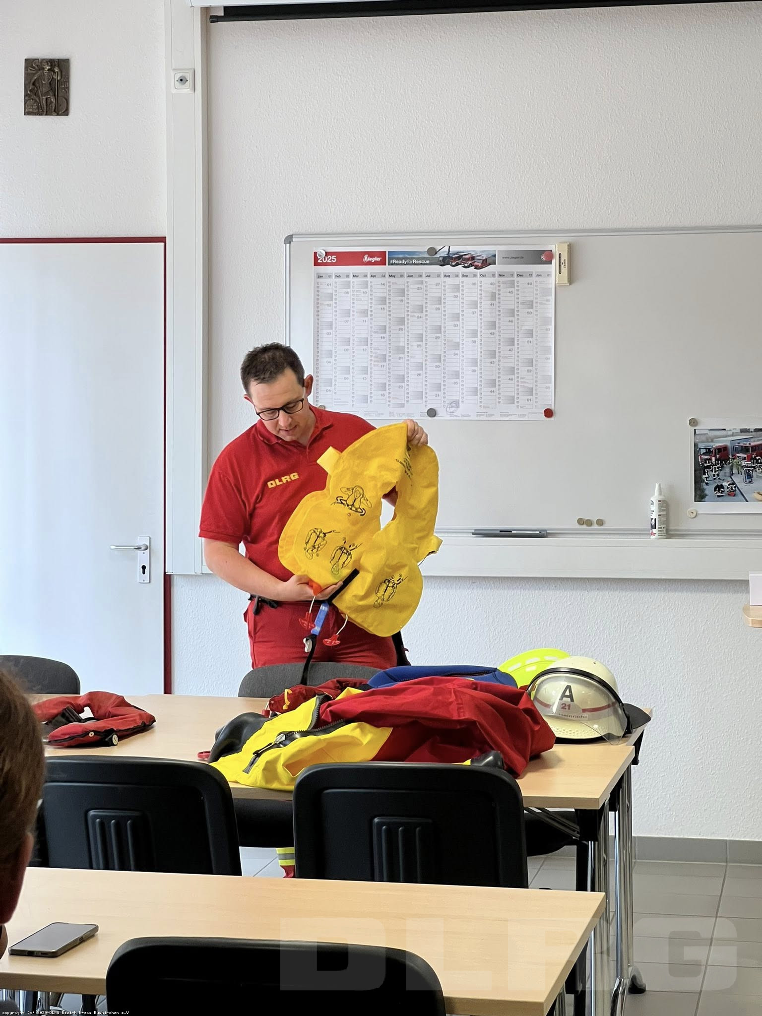 Zunächst gab es eine Theorieeinheit. Hier haben wir auf die Gefahren von, am und im Wasser hingewiesen. Besonders wurde auf die Unterschiede der PSA (Persönliche Schutzausrüstung) eingegangen. So ist z. B. nicht jeder Helm für alle Gefahren geeignet.